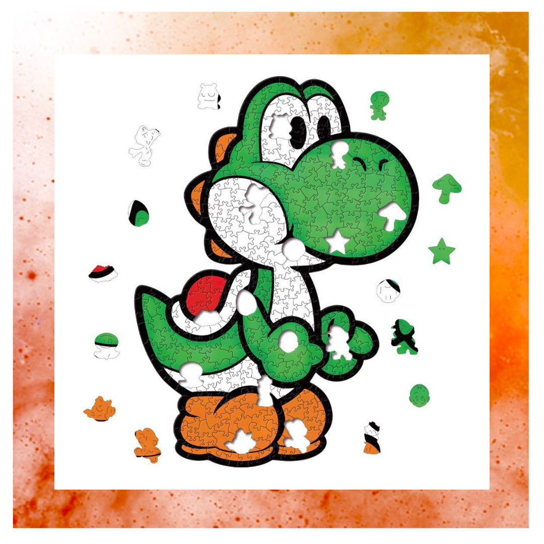 Yoshi puzzle containing pieces with shapes related to the theme of Mario video games.