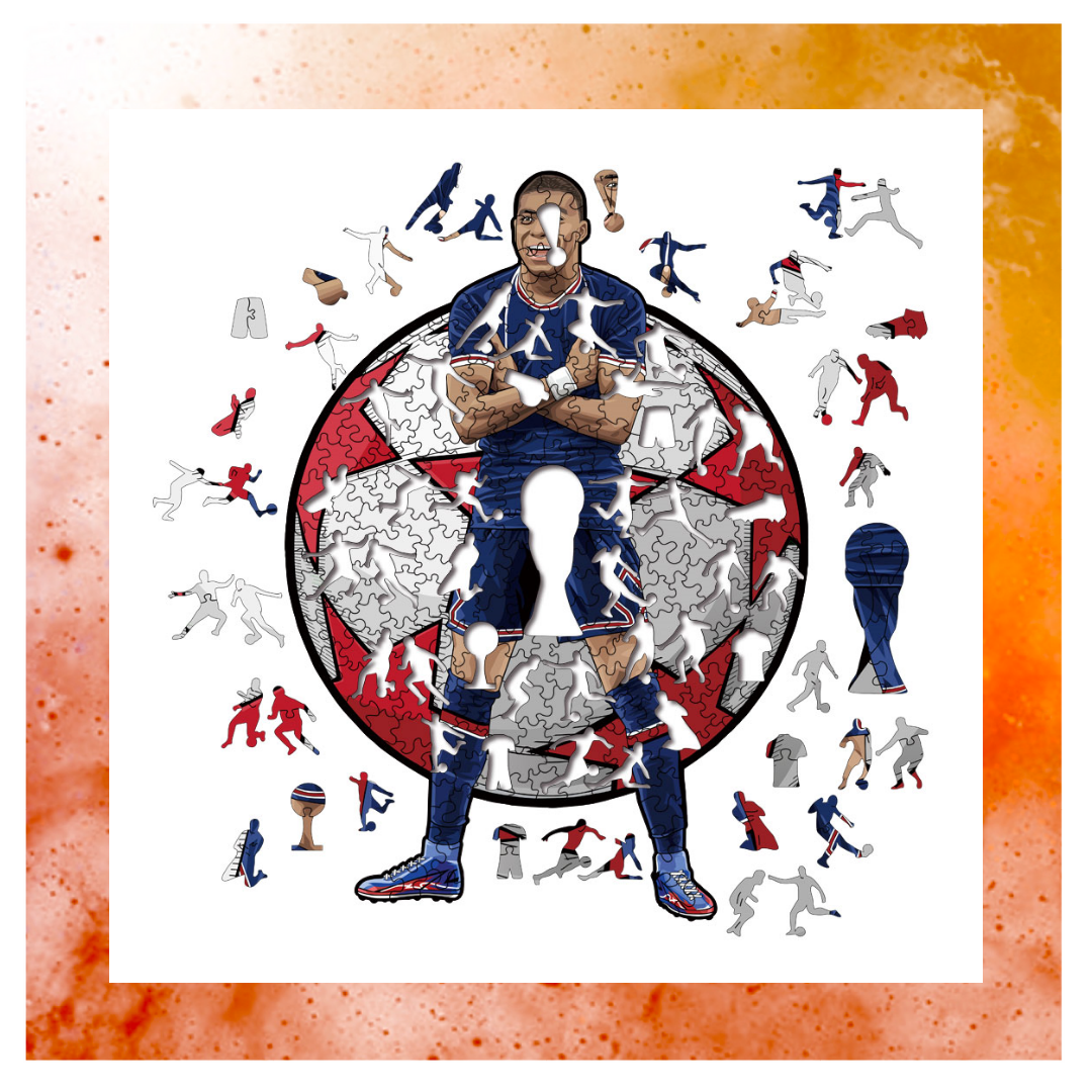 Puzle de Mbappé PSG que contiene piezas con formas relacionadas con la temática de fútbol.