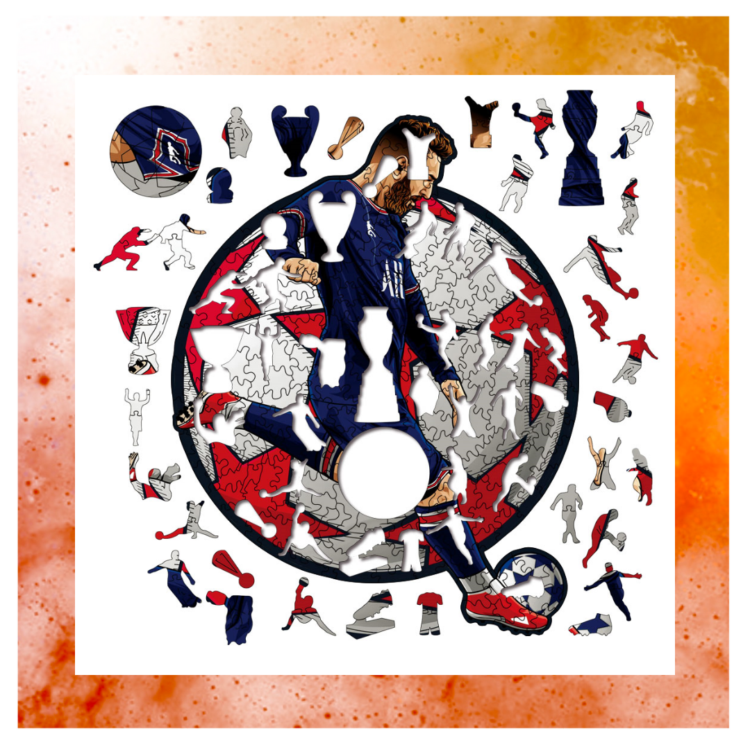 Puzle de Messi PSG que contiene piezas con formas relacionadas con la temática de fútbol.