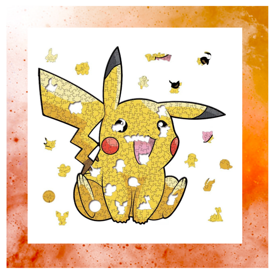 Puzle de Pikachu sentado que contiene piezas con formas relacionadas con la temática del anime de Pokémon.