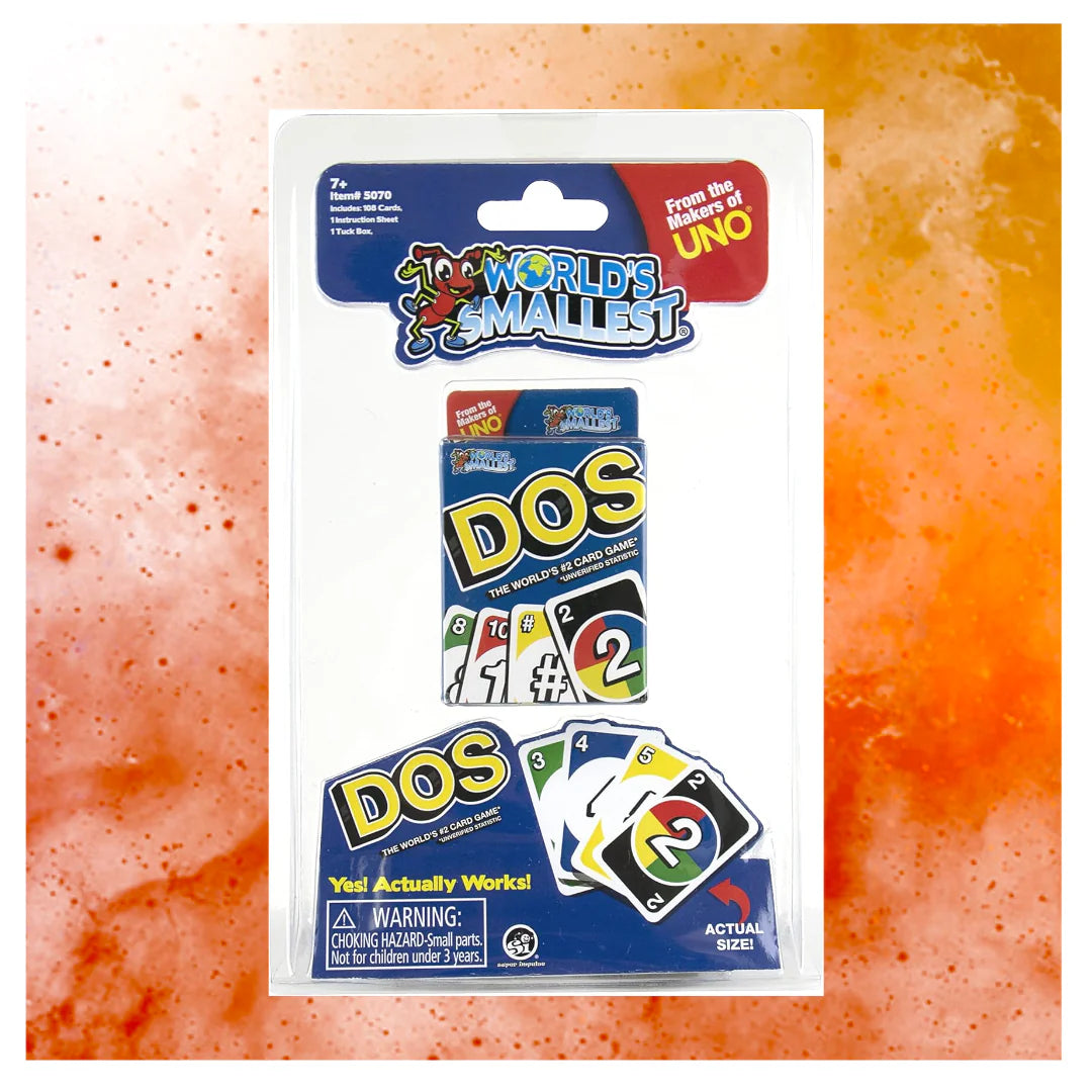 - ¡El favorito de las noches de juegos familiares, Dos, ahora está disponible en un tamaño que cabe en la palma de tu mano! Mide sólo 6,3 x 5 x 2 cm.